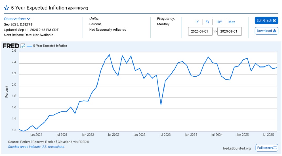 For much of last year, long-term inflation expectations were in decline. Beginning in October, inflation expectations started to move higher, and that trend continued in the first quarter of 2025 and has since leveled out near levels that are near the top of the range of expectations over the last three years. See these inflation expectations in the Federal Reserve Bank of Cleveland chart below: